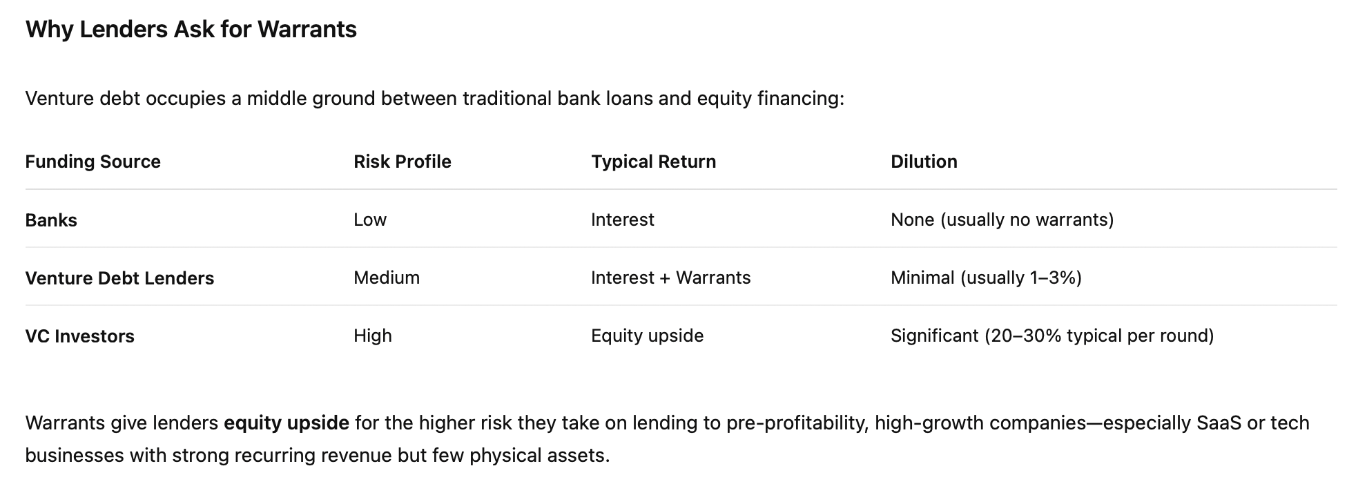 Table describing why venture debt lenders ask for warrants